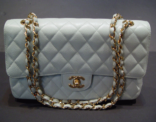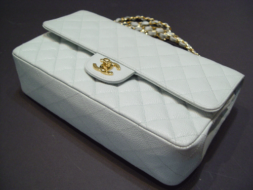 샤넬 캐비어 하늘색 클래식 숄더백 캐비어와 금장 체인이 매치된것으로 너무나 산뜻하며, 동시에 클래식한 멋을 느낄수 있는 백 입니다 사용으로 자연스러운 때와 스크래치, 마모 조금 외에는 별다른흠 없이 양호합니다
