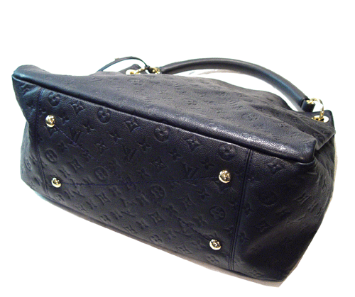 화려하게 엠보스 처리된 모노그램 앙프렝뜨 레더에 고급스러운 장식 핸들과